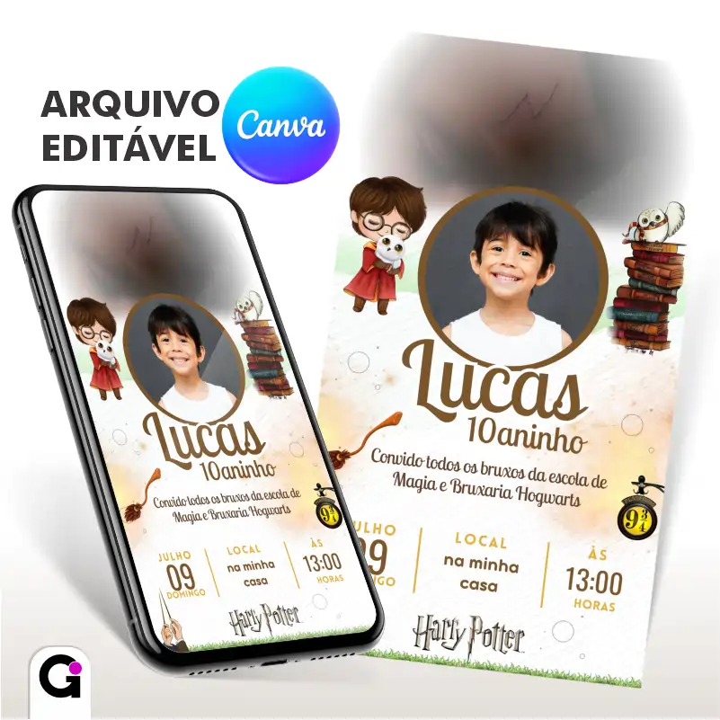 Com espaço especial para a foto do aniversariante, animações incríveis e um visual digno do mundo bruxo, você terá um convite que não apenas informa — ele encanta, surpreende e cria expectativa para a festa. ✨