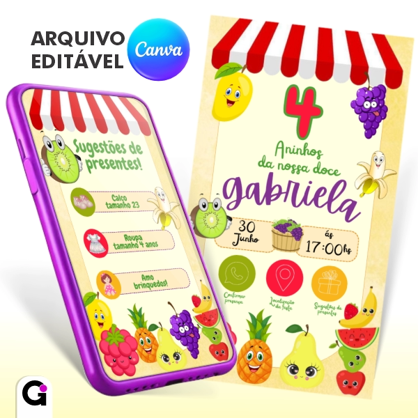 O convite digital frutas é perfeito para quem deseja um convite infantil vibrante, moderno e 100% digital. Com formato interativo, você cria uma experiência prática e divertida para seus convidados.