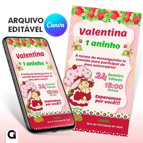 Com um design retrô encantador, esse convite é perfeito para quem ama nostalgia, cores suaves e toda a doçura da clássica Moranguinho. Ideal para aniversários infantis, chá de bebê e festas temáticas.