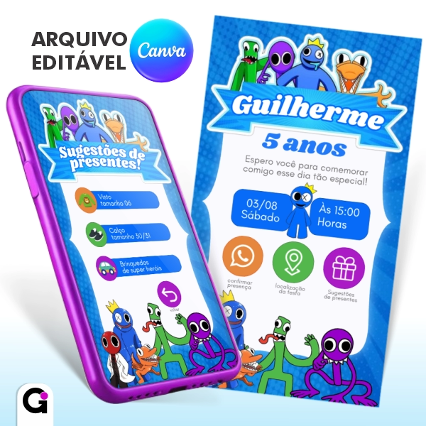 O convite digital rainbow friends é perfeito para quem quer um convite infantil criativo, colorido e 100% digital. Com formato interativo, ele oferece praticidade e uma experiência divertida para os convidados.